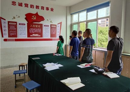 首先,全体党员面向党旗,举起右手,持立正姿势重温入党誓词。