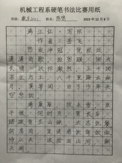 机械工程系2023年硬笔书法比赛优秀作品展示: