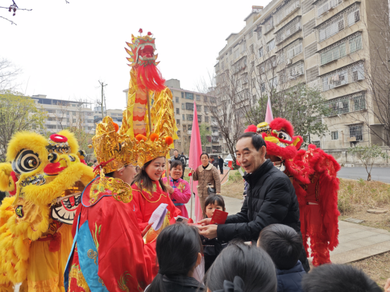 工作人员按照部门以及到实训楼前现场参加活动的人送祝福。金龙和财神爷、财神婆按照游园路线为每位院领导、每个部门送上新年贺卡。