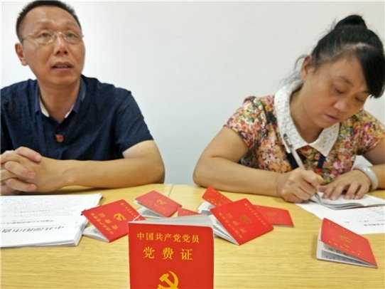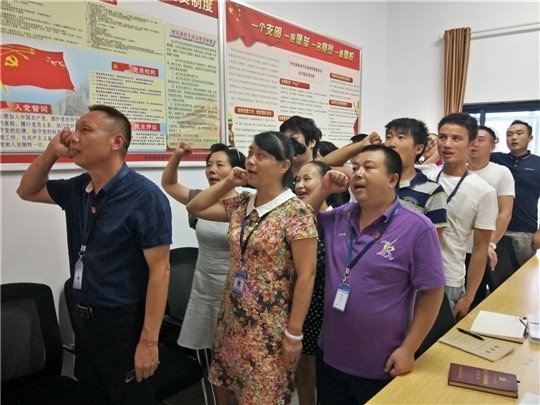 17日下午,现场交完党费之后,党员们面向党旗党章,举起右手,用他们整齐的宣誓词传递着他们坚定不移的心声。重温入党誓词,让每一位党员时刻警醒,不忘初心,坚定了为共产主义事业奋斗终身的意志。
