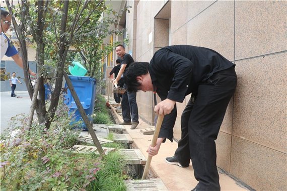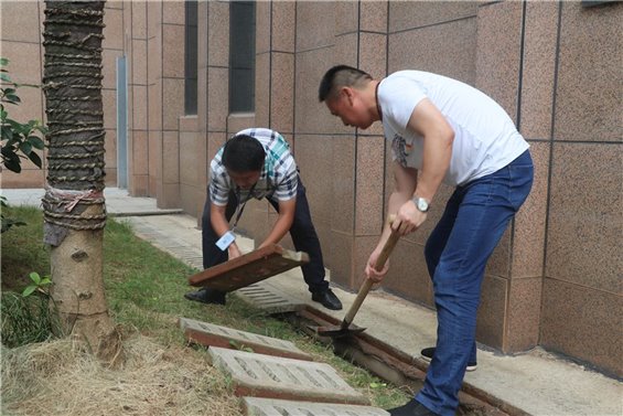 共产党员总是出现在最需要的地方,长沙校区的党员和入党积极分子们,也身体力行的证实了这一定律。18日下午,长沙校区全体党员和入党积极分子们拿起扫把,挥起铁钎,搬起重物。男同志们投入至校园最脏最难处理的下水系统的卫生清理工作中,一钎钎的污泥和垃圾,从堵塞的沟渠中清理出来,却汗湿了每一位同志的衣衫。女同志们也没有闲着,她们一扫帚一簸箕的将校园内所有的角落进行了清扫,确保无烟校园内找不到一个烟头,一个垃圾。原本红灿灿的党徽在阳光下更是熠熠生辉。