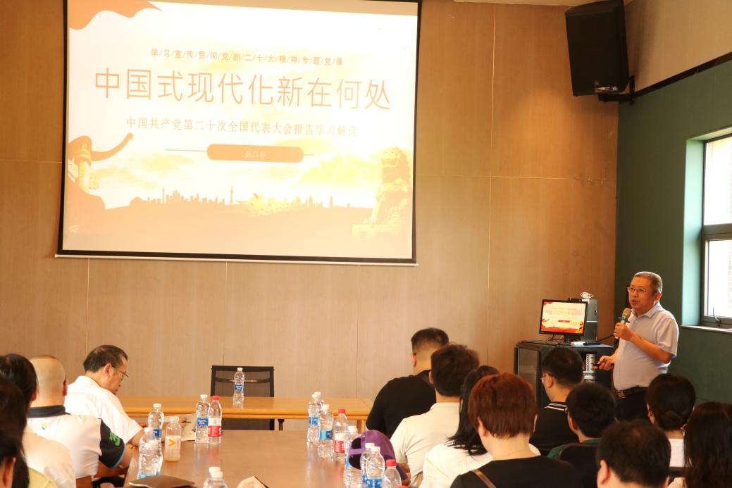 全体党员首先来到了田汉文化园游客中心会议室,在这里,分校副校长、教学党支部书记彭昌春以《中国式现代化新在何处》为题主讲了一堂非常精彩的党课。彭昌春从什么是“中国式现代化”、为什么是“中国式现代化”、中国式现代化“新”在何处、中国式现代化将如何开辟人类新路四个层面对中国共产党第二十次全国代表大会报告进行学习和解读,通过理论讲解和实例列举,生动详实地论述了中国式现代化道路将为人类实现现代化提供新选择,开辟出一条21世纪现代化新路,创造人类文明新形态。