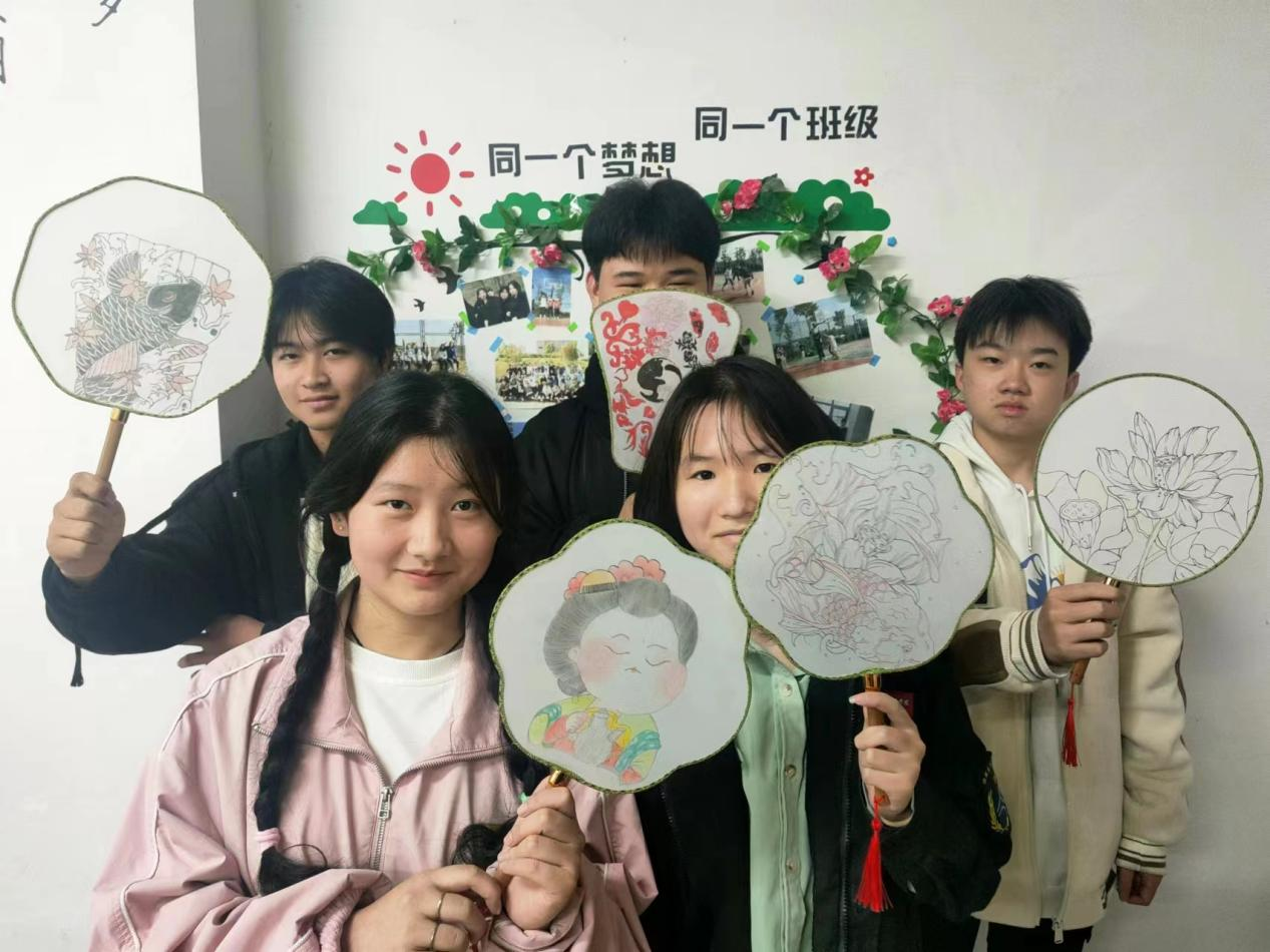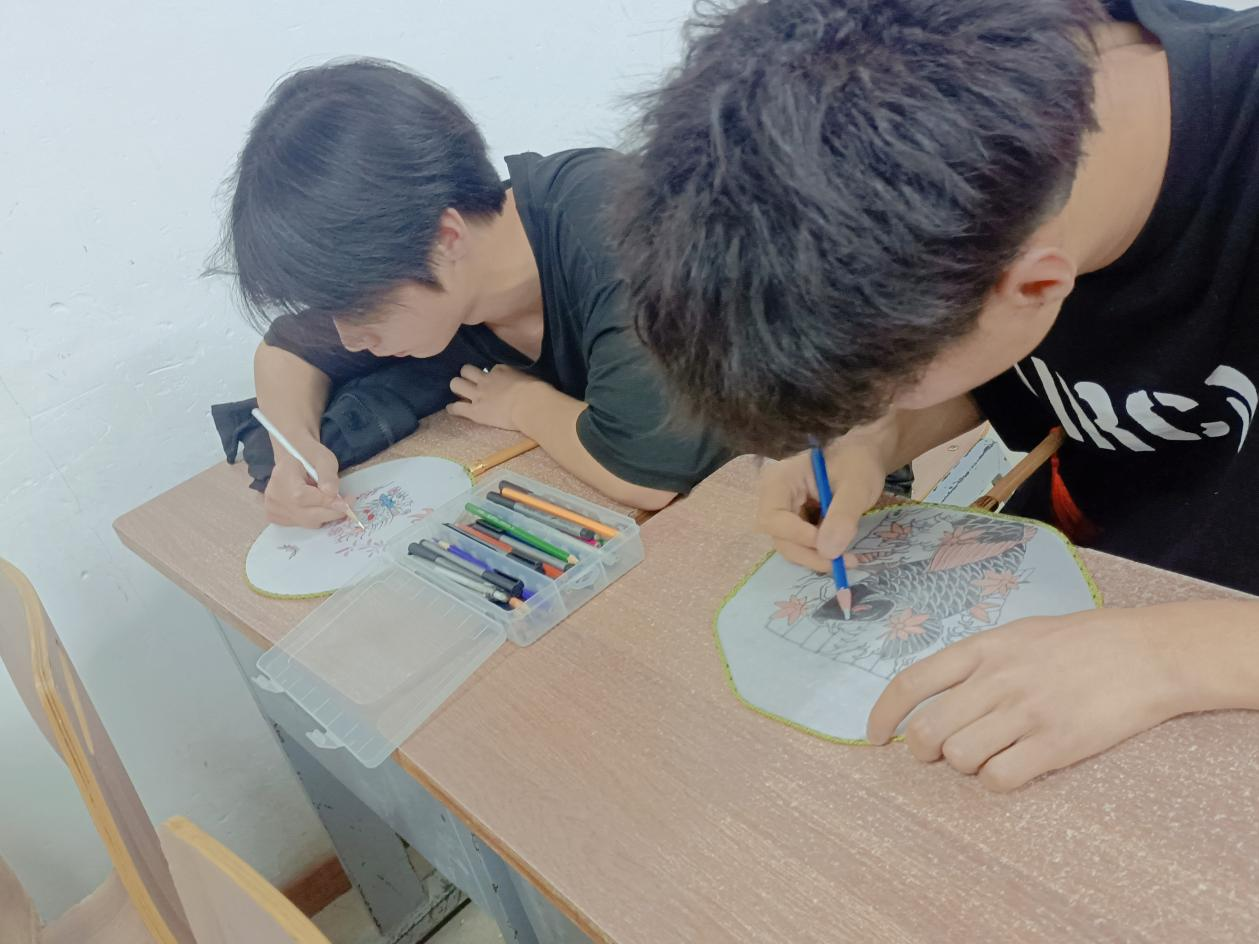 扇子刚入手,大家便迫不及待地动手绘画起来。一笔笔、一画画,空空如也的扇面开始变得缤纷多彩、妙趣横生,有的同学画上了自己喜爱的卡通人物,有的画上了适合团扇的植物,有的写上了自己的美好愿望,一幅幅五颜六色的扇子画在他们的精心雕琢下大功告成了。亲手做出的扇子轻轻摇曳时,不仅让大家感受到凉爽清风,更传承着中国优秀的传统文化,让传统文化的种子在同学心中生根发芽、茁壮成长。