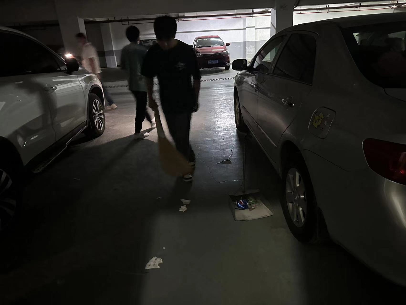 第六节课下课后,同学们携带各种清洁工具,包括扫把、拖把、抹布等,来到学校的地下停车场,按照事前的分组安排迅速投入到紧张而有序的劳动中,有的负责扫除地面上的垃圾,有的擦拭栏杆和门上的污渍和尘土。在同学们的共同努力下,原本有些脏乱的地下停车场逐渐变得干净整洁起来。