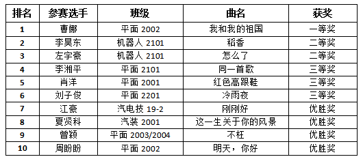 本次校园”十佳歌手“大赛分为初赛,复赛和决赛三个部分,历时近一个月。经过班级初赛推选,共有80多名学生进入复赛,再经过一轮筛选,共有13名选手脱颖而出,进入决赛。他们利用课余时间认真准备,多次排练,力争取得好的成绩。决赛的舞台上,他们尽情散发着自己的魅力,用嘹亮的歌声感染着现场每一个人。通过激烈的比拼,最终曹娜、李昊东、左宇豪、李湘平、肖洋、刘子俊、江豪、夏贤科、曾颖、周盼盼荣获校园“十佳歌手”称号。