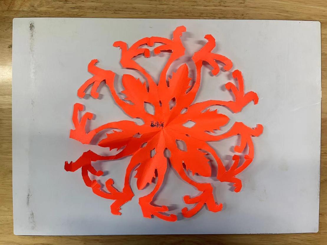 活动中,同学们相互协作,通过画纸折叠翻转,剪刀、刻刀起起落落,凭借一双手和一把剪刀,在短暂的时间里,让一张张毫不起眼的纸,变幻成一个个生动形象的图案、一幅幅色彩斑澜的剪纸艺术作品。随后,5名评审根据作品的线条流畅、比例和谐、整体美观等进行总体评价。最终,经过认真的评选,三幅剪纸脱颖而出,获评优秀。