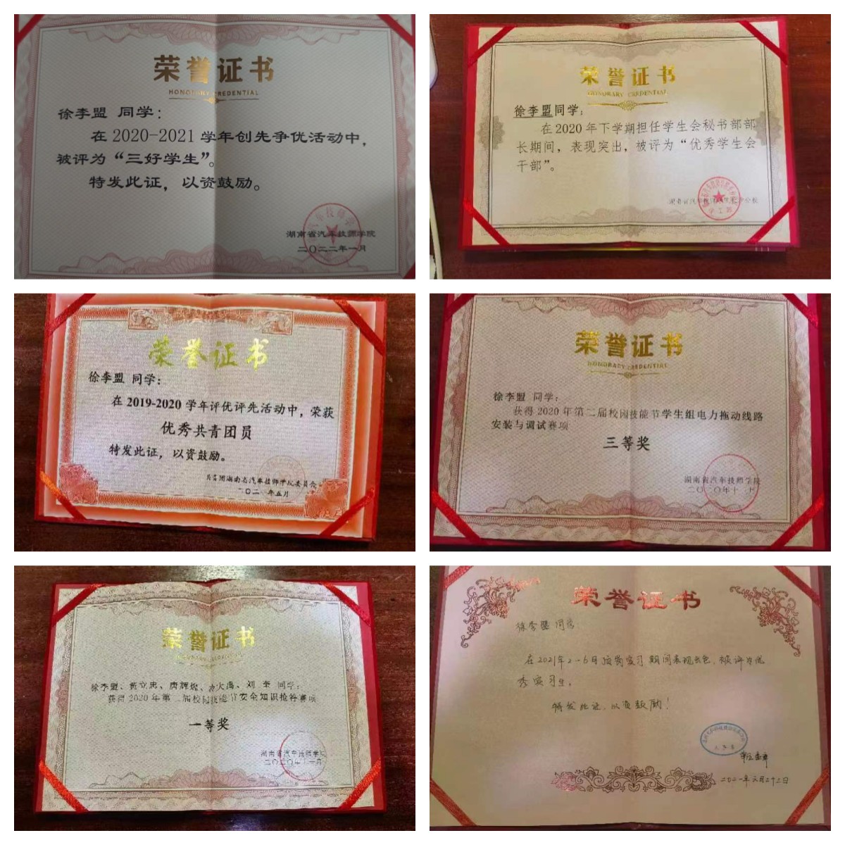 徐李盟不仅在学业上始终保持前列,还积极参与各类校园活动,凭借积极表现引起了分校团委学生会的关注并获邀加入了学生会,历任文体部干事、部长、副书记,成为老师们的得力助手。在去年分校疫情封闭管理期间,徐李盟积极主动投身防疫志愿工作,无论是核酸检测还是错峰就餐,总能够看到他忙碌奔走的身影。凭借优异表现,他先后获评优秀共青团员、优秀学生干部、三好学生。2021年上学期工学交替期间,他认真工作,虚心求教,表现突出,获评优秀实习生。