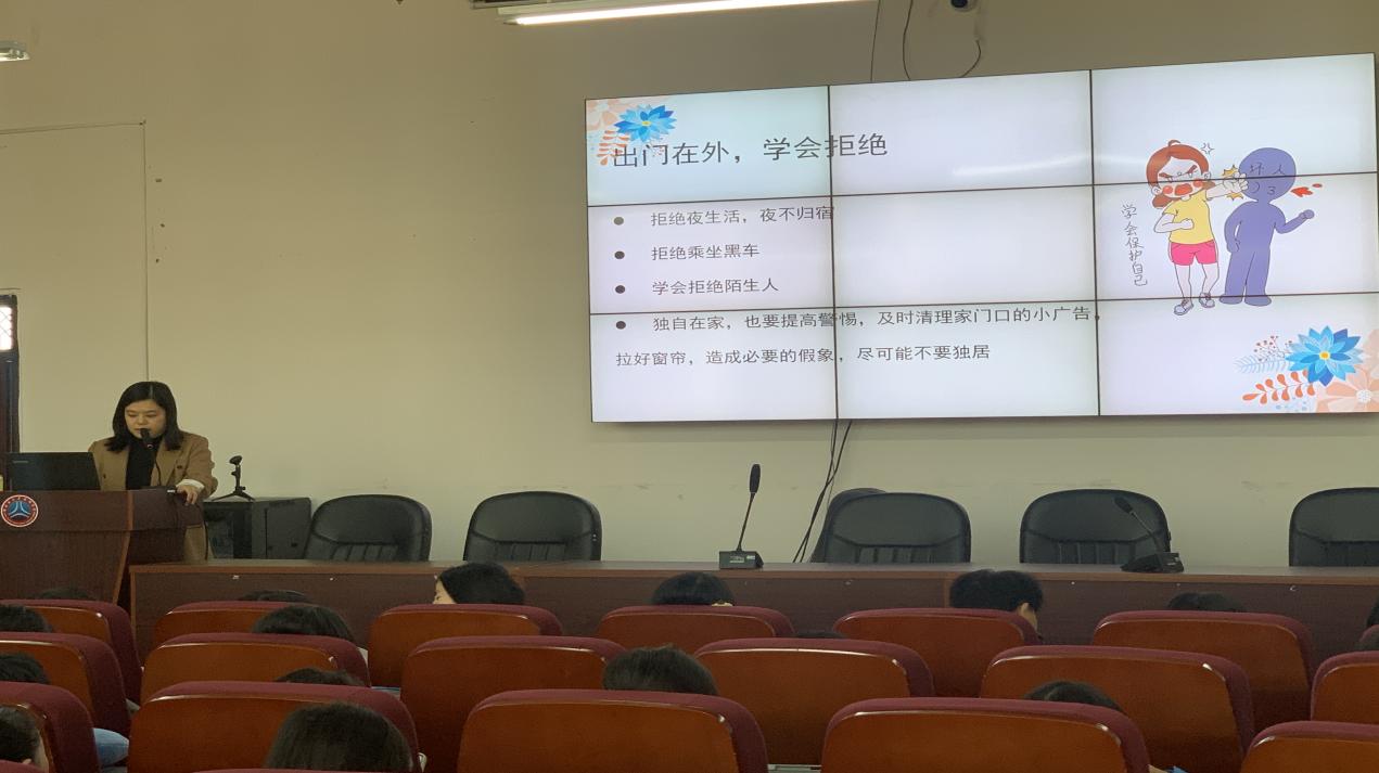 徐珂静老师就女生安全防范教育与自我保护、宿舍安全注意事项与晚寝制度等两个方面问题展开讲述,她将安全防范问题分为人身安全、情感安全两部分,运用实例向同学们讲授女生在危险时刻应如何保护自己,特别指出作为女生要有自尊自爱之心,要自立自强。最后,徐珂静对在座的女生提出“师心三愿”,强调每一位女生都是无价之宝,要学会自重自爱,不要被小恩小惠收买,做独立、坚强、上进的女子!