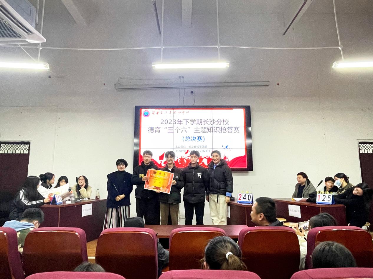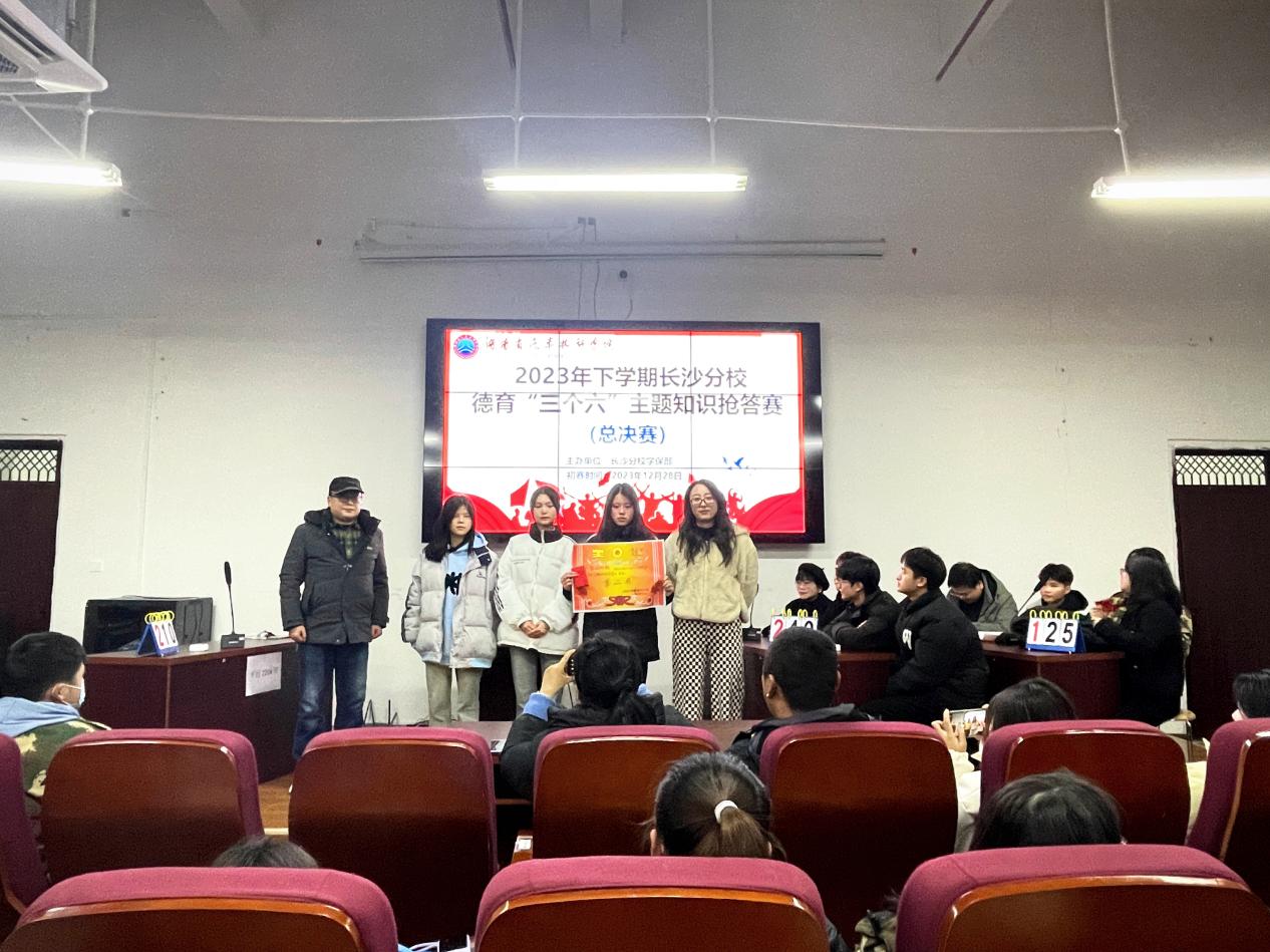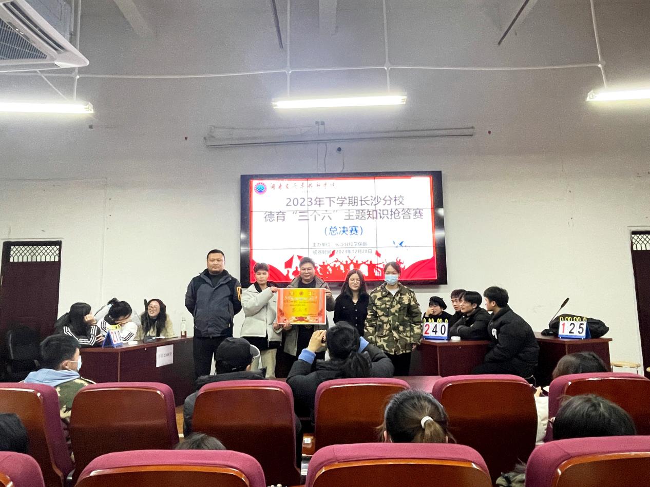 为进一步加强学生社会主义核心价值体系教育,贯彻落实学院德育“六讲六无六主题”主题教育活动重点工作,加深学生对德育“三个六”主题教育的理解,增强将理论知识应用于实际的能力,使德育工作落到实处,2023年12月,长沙分校开展了为期近1个月的德育“三个六”主题知识竞赛活动。12月28日,通过层层选拔的三支队伍在学术报告厅举行了总决赛,长沙分校德育“三个六”主题知识竞赛活动圆满落幕。